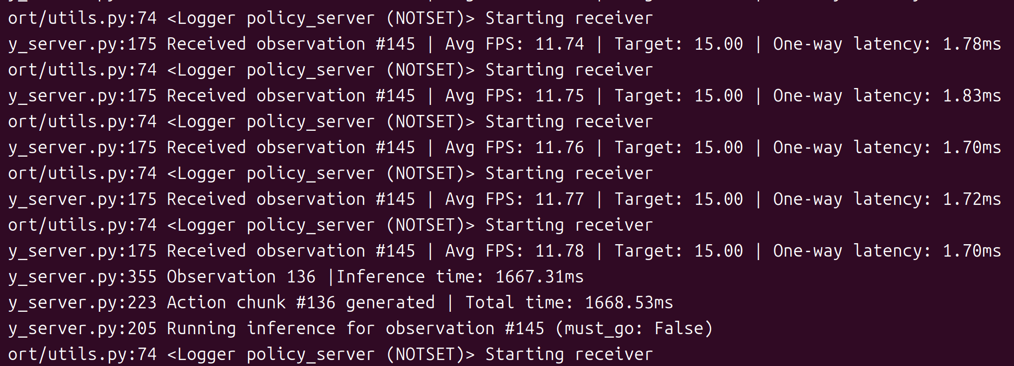 INFO 2025-08-28 10:41:15 y_server.py:175 Received observation #0 | Avg FPS: 3.45 | Target: 30.00 | One-way latency: -9.58ms
