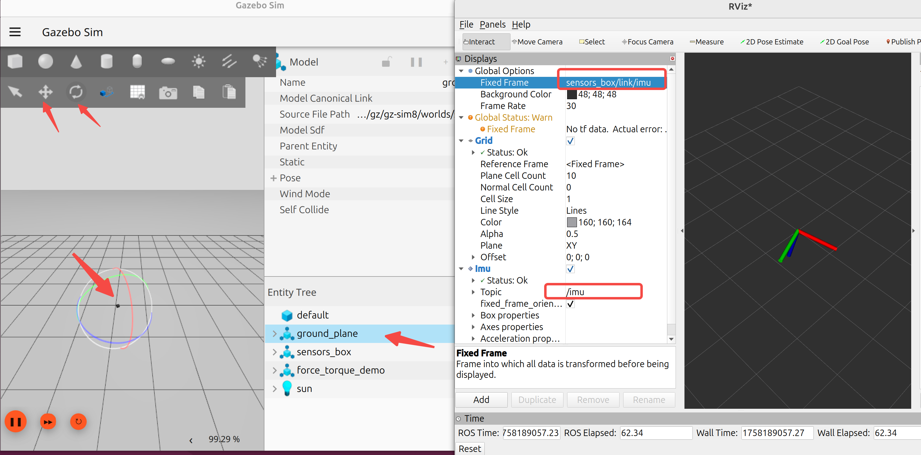 可以在仿真器中选择工具Translate(十字箭头图标)、Rotate(圆弧箭头图标)调整位置和角度,可以看到右边RViz中的也会跟着变化。