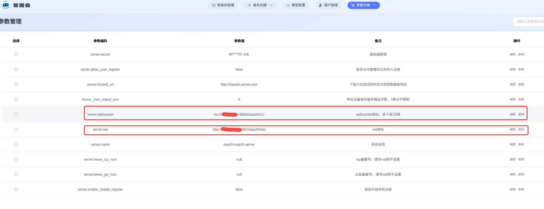 由于是全模块部署,所以需要登陆智能控台,设置ota和websocket的接口,需要注意的是weboscket的启动必须是要等xiaozhi-server app启动才能设置。