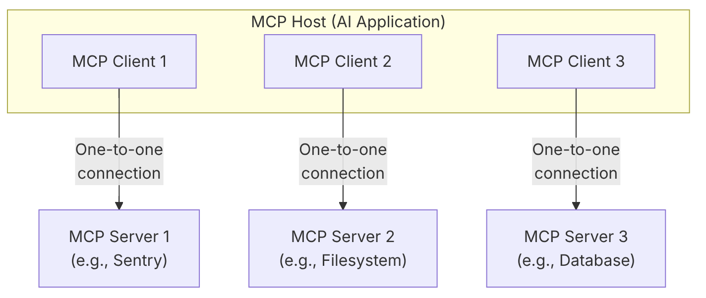 下面来举个例子,Visual studio Code作为MCP Host。当Visual Studio Code与MCP Server建立连接时,Visual Studio Code运行时会实例化一个MCP Client对象,该对象维护与Sentry MCP服务的连接。当Visual Studio Code随后连接到另一个MCP Server时,Visual Studio Code运行时会实例化另一个MCP Client对象以维护此连接,从而保持MCP客户端与MCP服务器的一对一关系。