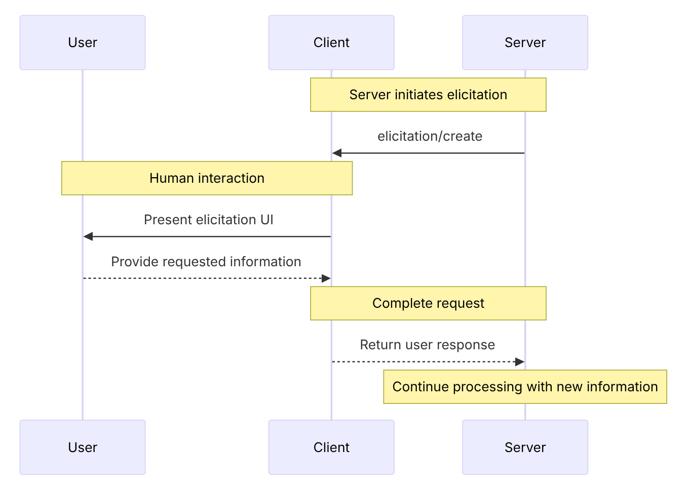 Elicitaion提供了一种结构化的方式,让server按需收集必要信息。server不再需要一开始就获取所有信息或在数据缺失时失败,而是可以暂停操作,向用户请求特定的输入。者创造了更灵活的交互方式,server能够根据用户需求进行调整,而不是遵循僵化的模式。下面提取的流程: