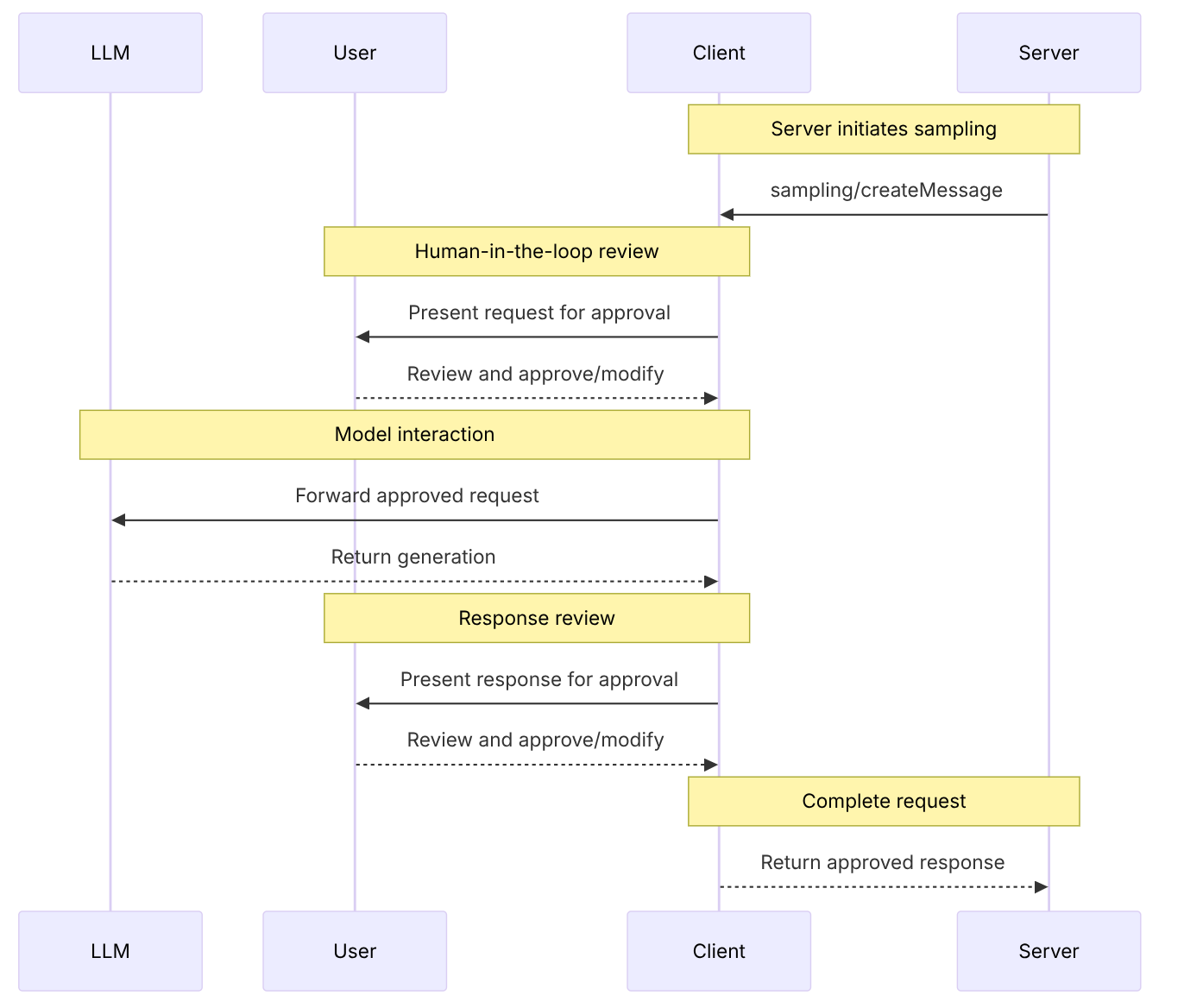 采样允许server通过client请求语言模型补全,在保持安全性和用户控制的同时,实现代理行为。