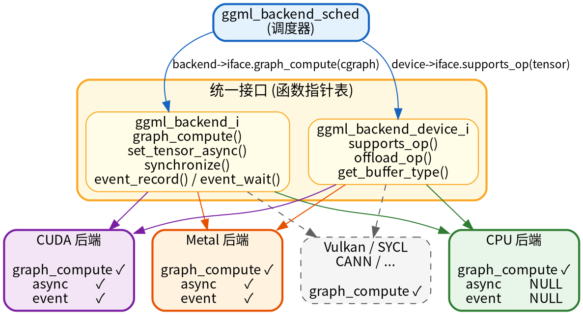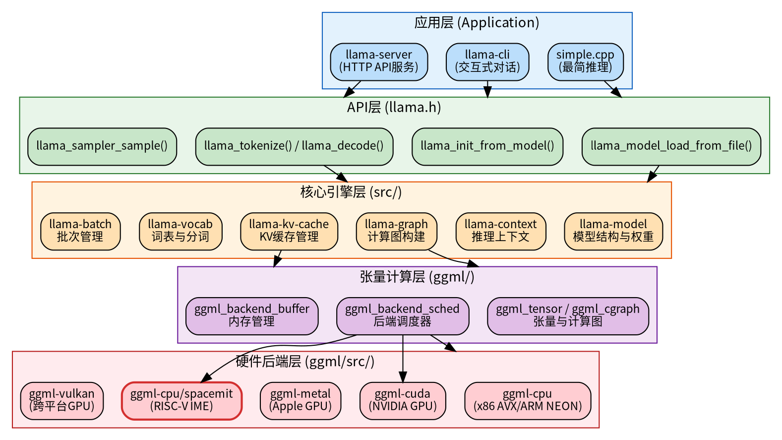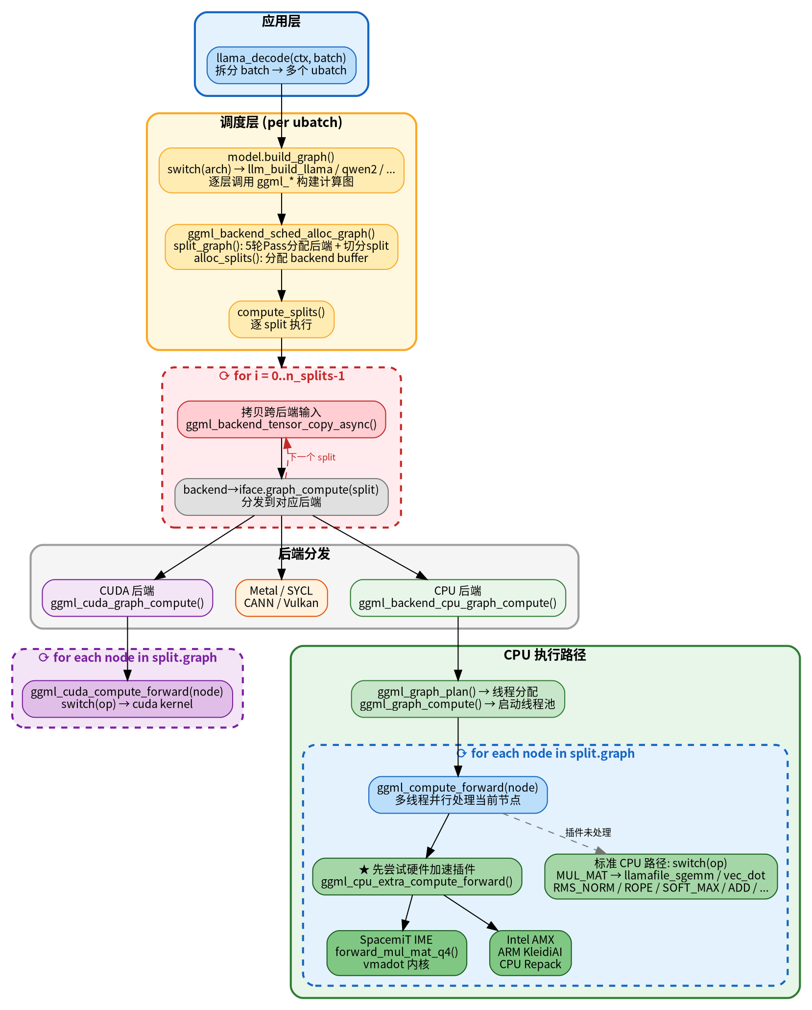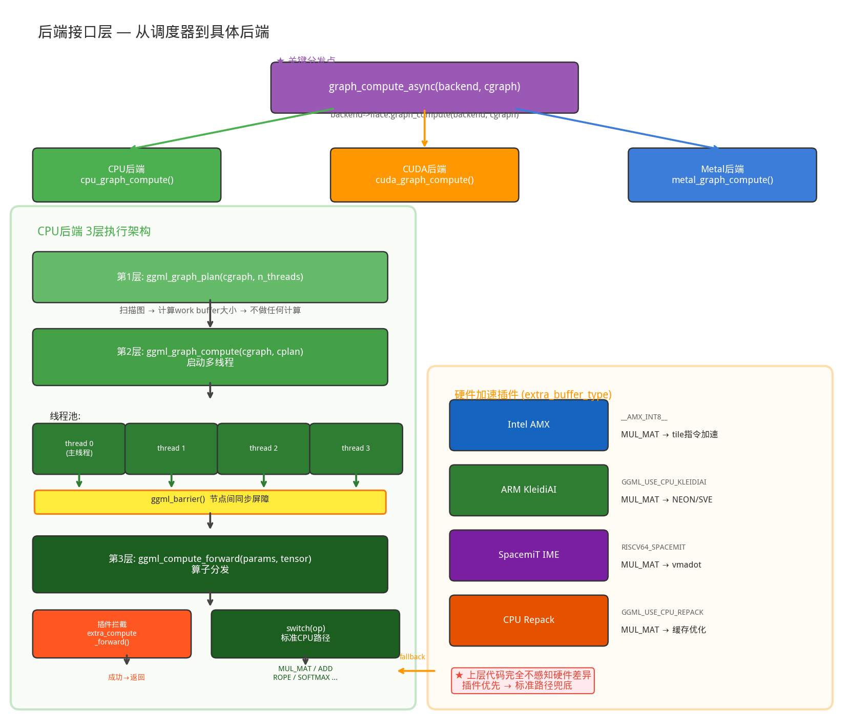 上层代码完全不感知硬件差异。无论是 x86 的 AMX、ARM 的 KleidiAI 还是 RISC-V 的 IME,都通过同一个插件接口注入,标准 CPU 路径作为通用 fallback 始终可用。
