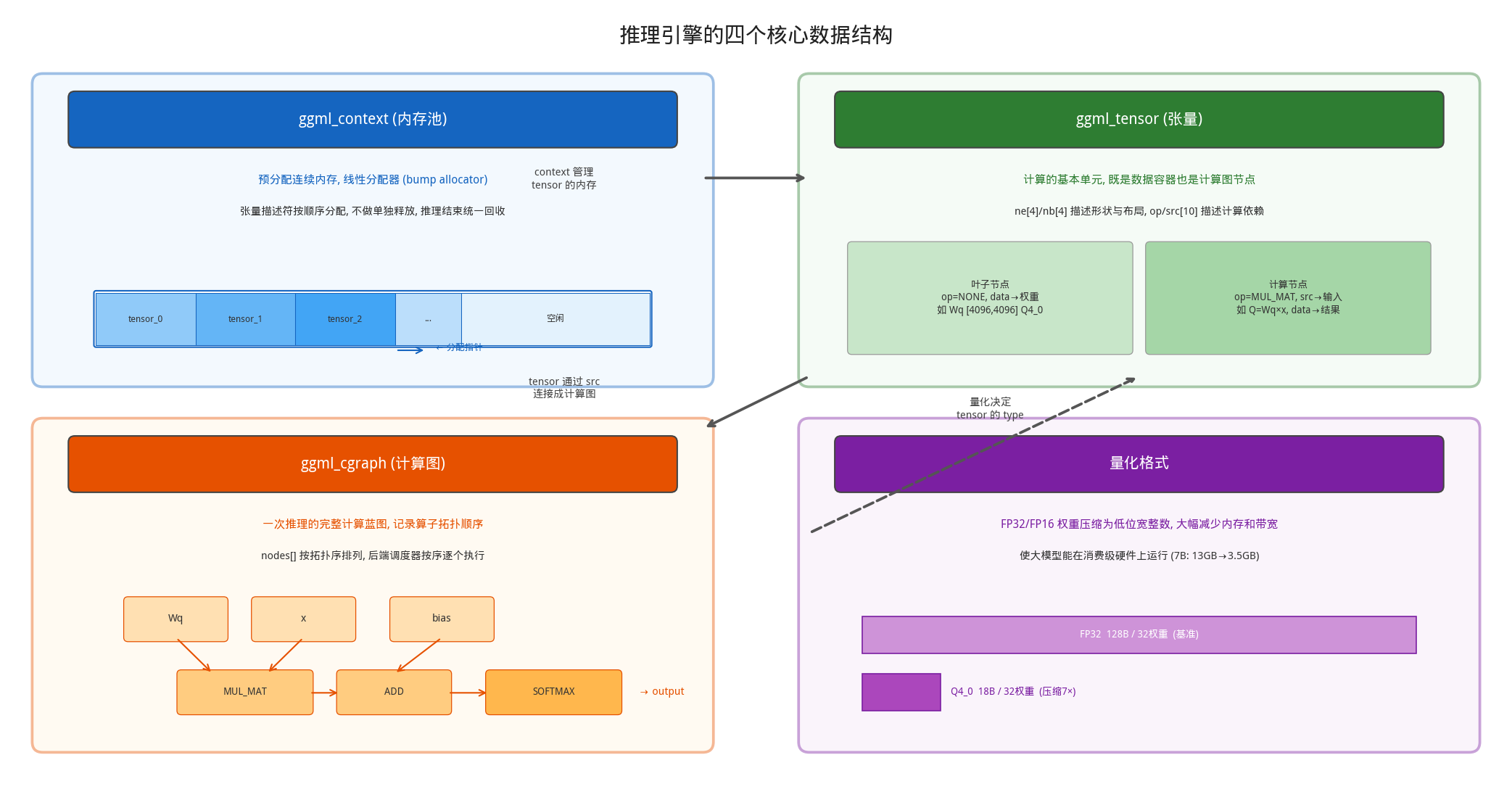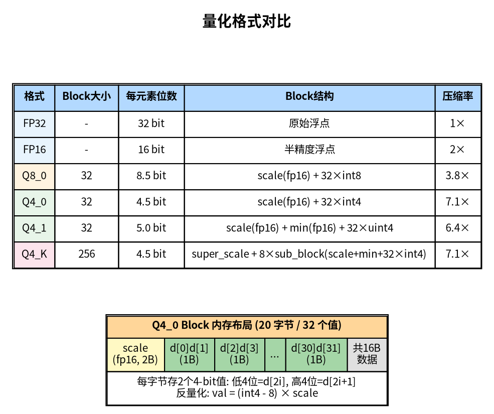 • Tensor Info:每个权重张量的”目录”——包含张量名称(如 blk.0.attn_q.weight)、维度数组(如 [4096, 4096])、数据类型(Q4_0/Q8_0/F16/F32 等)以及该张量在数据区中的字节偏移量。这里只记录元信息,不含实际权重数据,类似于书的目录页。