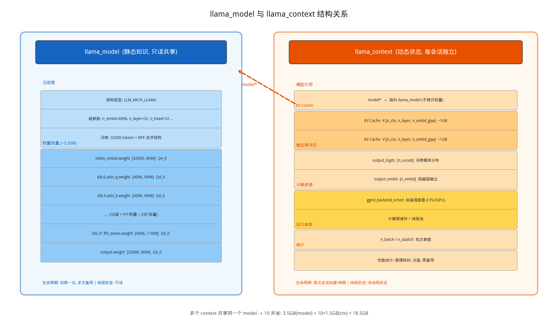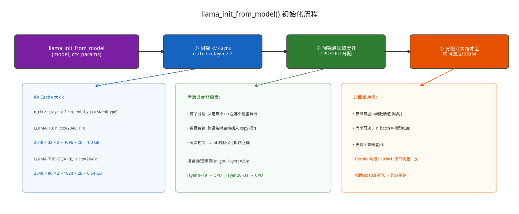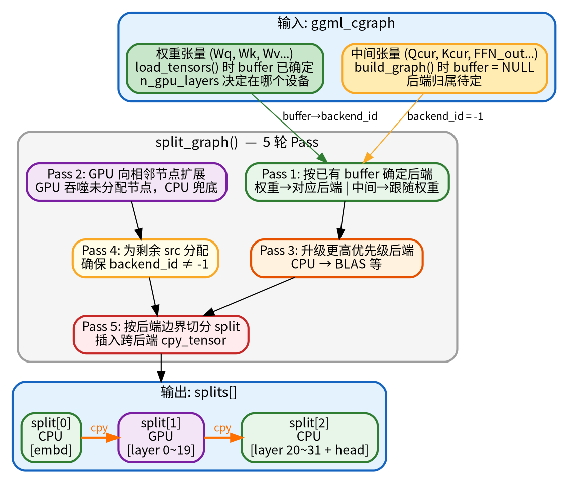 • 张量描述符创建:对于 LLaMA-7B,需要创建约 290+ 个张量描述符(1 个 token embedding + 32 层 × 9 个权重/层 + 输出层)。每个描述符只是一个轻量级的元数据结构(约 400 字节),记录张量的名称、形状、数据类型和设备归属,不包含实际的权重数据。这里使用了 no_alloc = true 策略——先规划,后分配,避免在设备分配确定之前浪费内存。