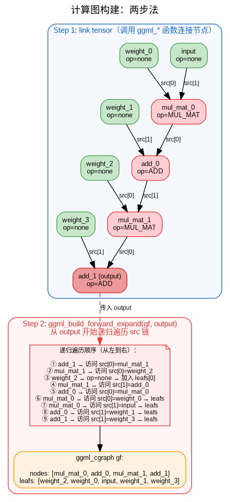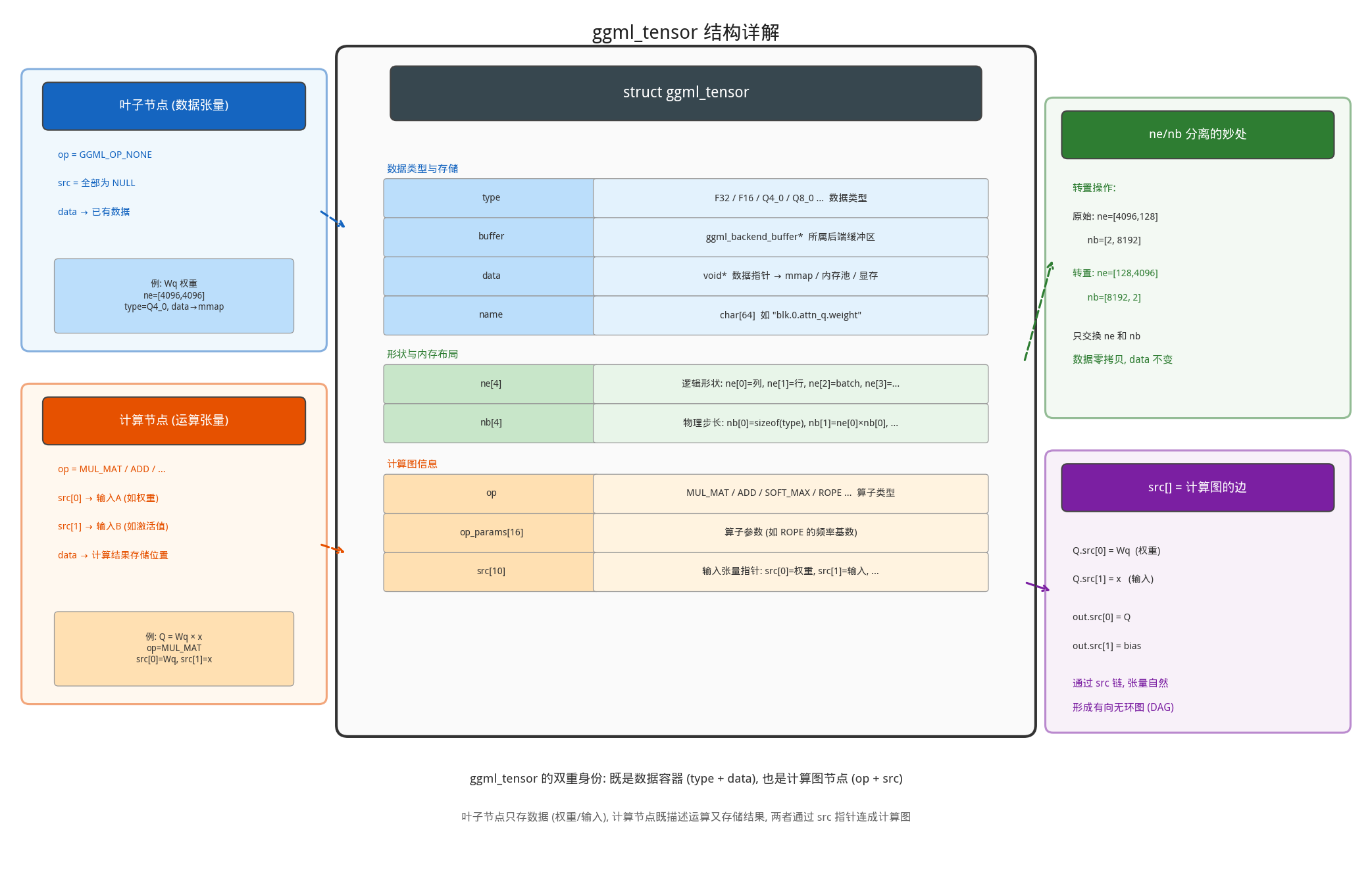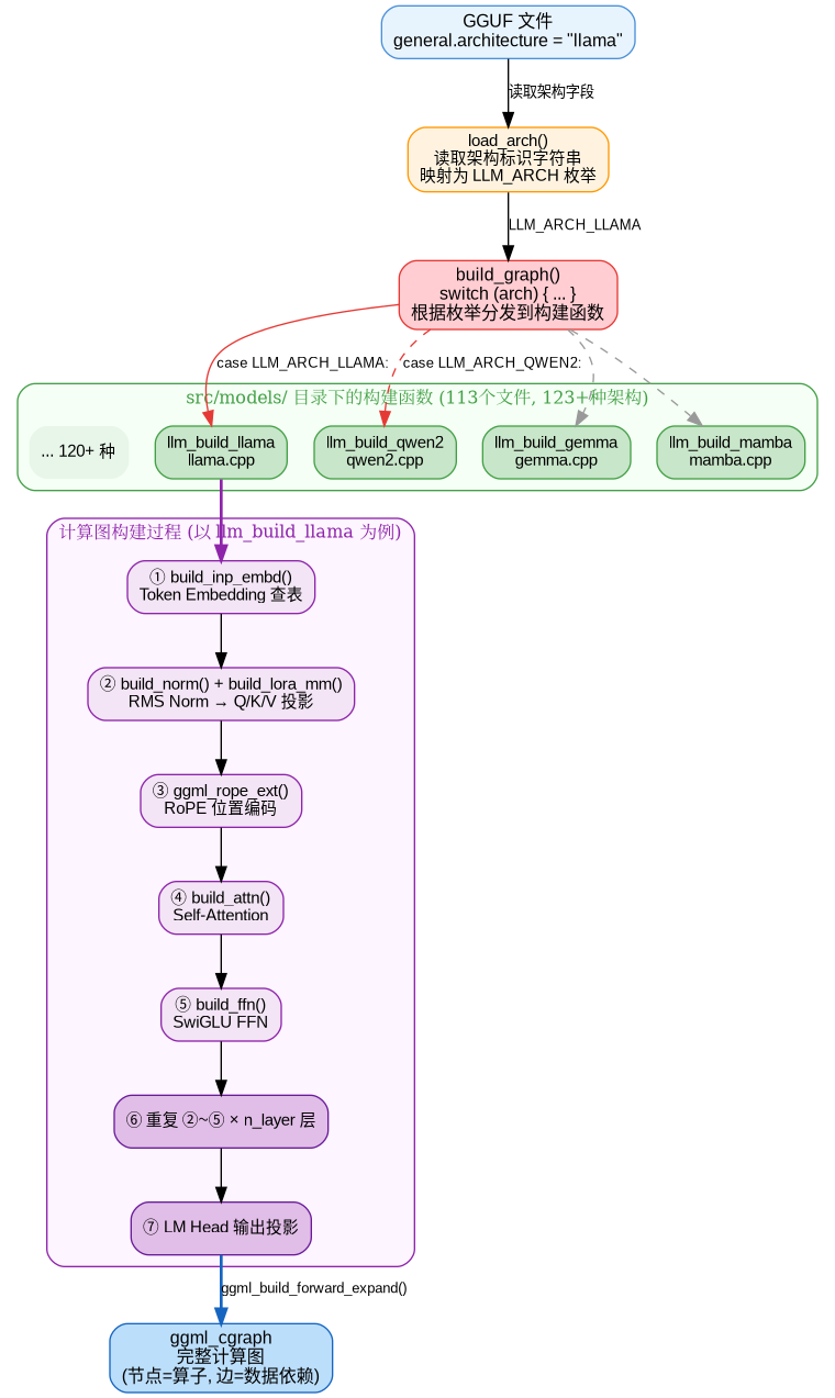 GGUF 文件只存储数据,不存储计算逻辑。矩阵乘法、softmax、残差连接等计算图操作并不在文件中,而是由 llama.cpp 代码根据模型架构(general.architecture)在推理时动态构建(详见下文)。换句话说,GGUF 回答的是”参数是什么”,代码回答的是”怎么算”。