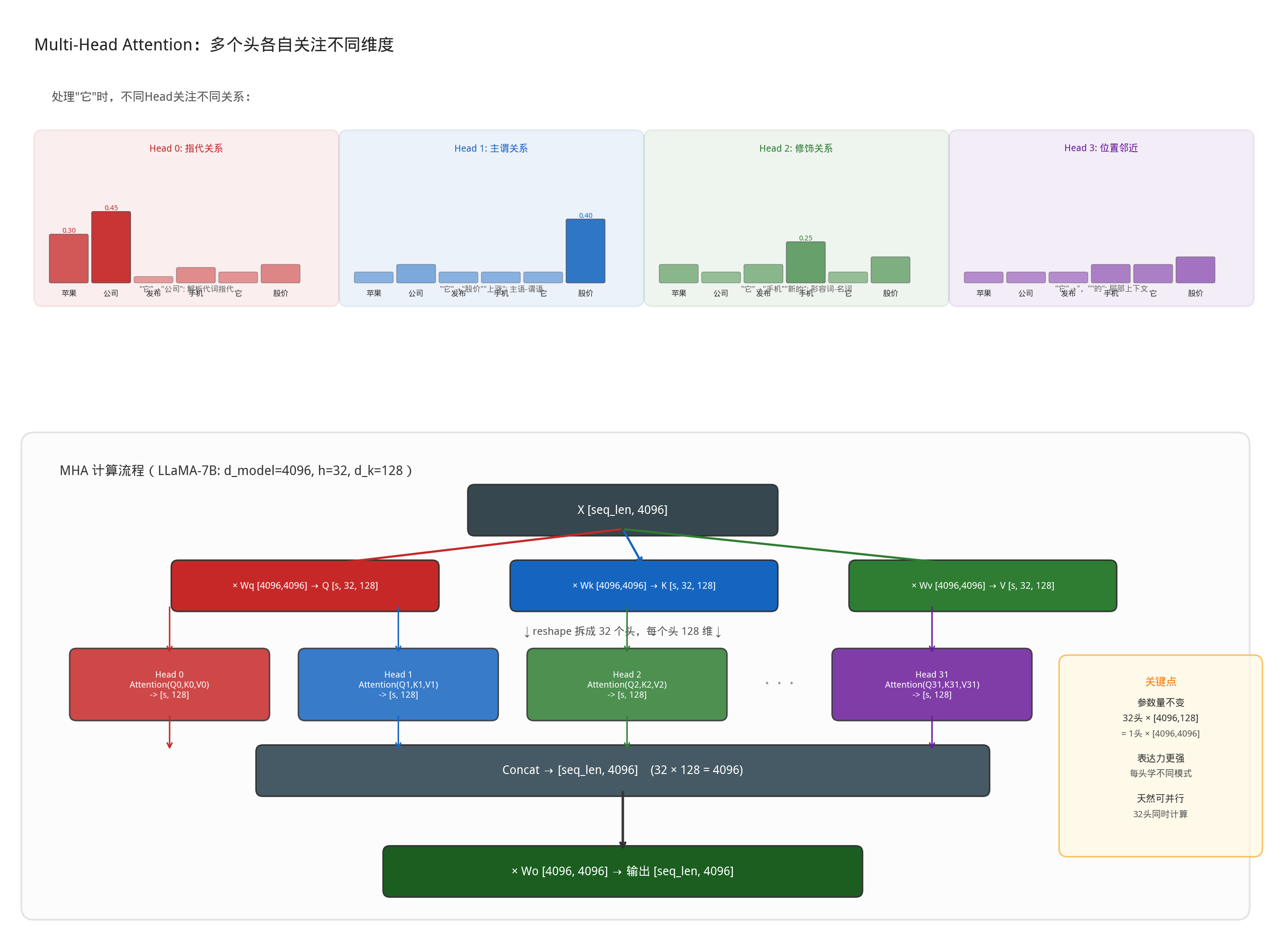 每个头只看 d_dmole / h 维的子空间(如 4096/32 = 128 维),计算量和单头 Attention 一样,但能并行捕捉多种关系。
