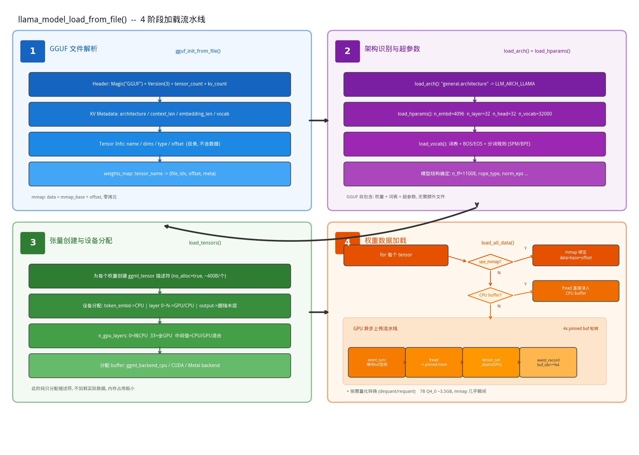 模型加载可以分为4个阶段:GGUF文件解析、架构识别与超参数、张量创建与设备分配、权重数据加载。