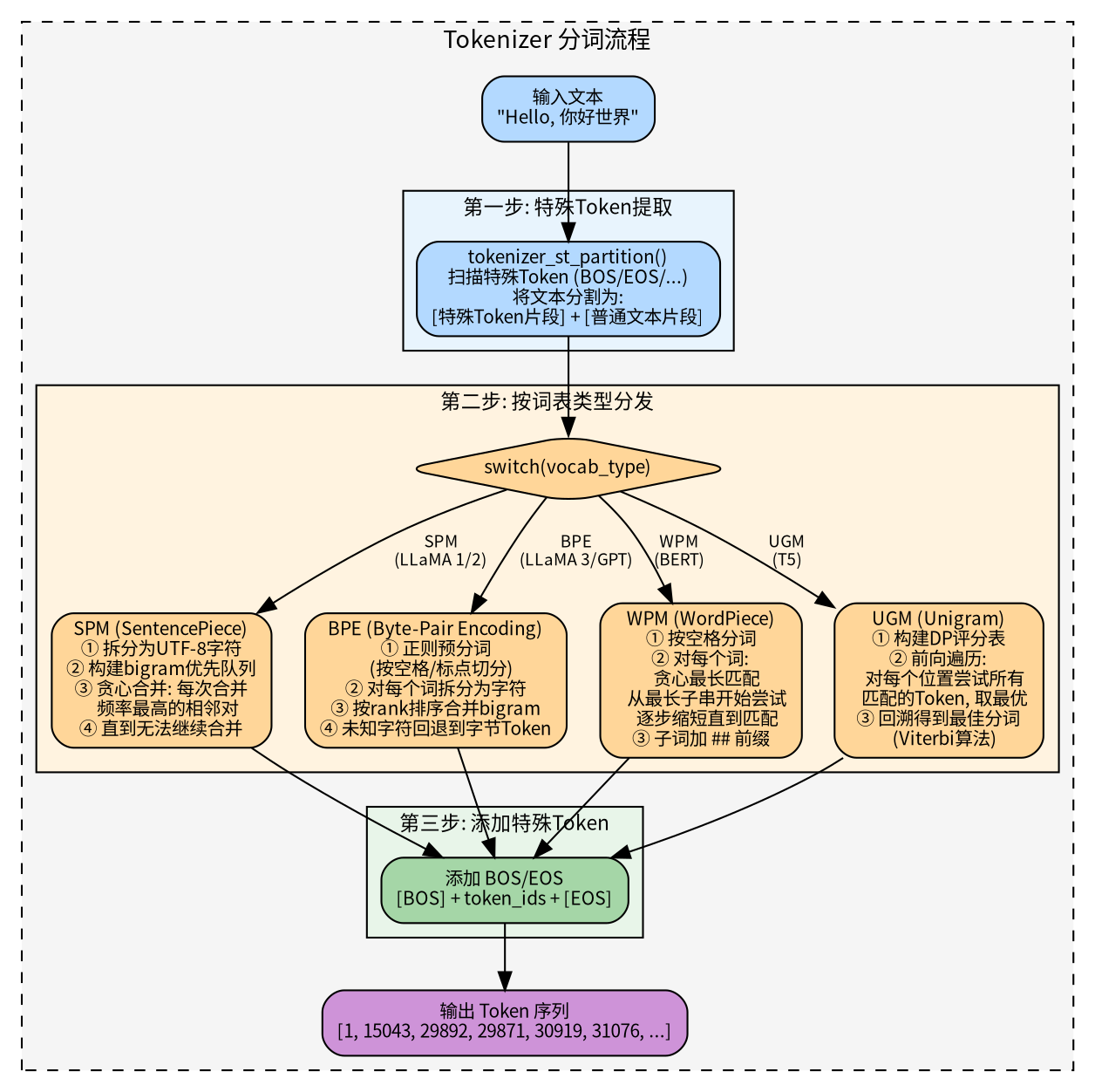 • load_vocab():从 KV 元数据中加载完整的词表信息,包括 token 字符串列表、分数/优先级、BPE 合并规则、特殊 token ID(BOS/EOS/PAD/UNK)等。这些信息在后续的分词阶段(下文)会被直接使用。