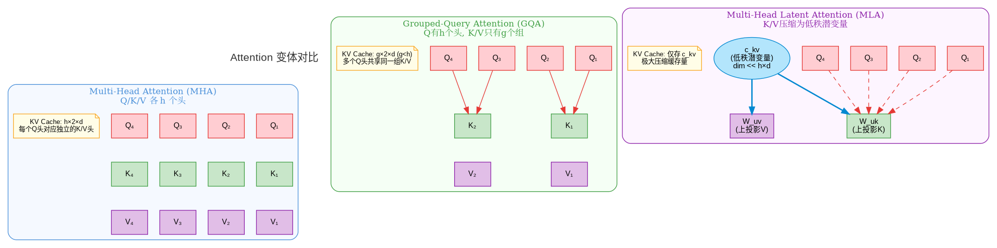 • GQA 由 Google 在 2023 年提出(论文:GQA: Training Generalized Multi-Query Attention),核心思想是让多个 Query 头共享同一组 Key/Value 头,从而减少 KV Cache 的大小。GQA 是 MHA 和 MQA 的折中——既显著减少了 KV Cache(LLaMA 3 使用 8 组 GQA,缓存压缩 4 倍),又保持了接近 MHA 的模型质量。LLaMA 2 70B、LLaMA 3、Mistral 等主流模型均采用 GQA。