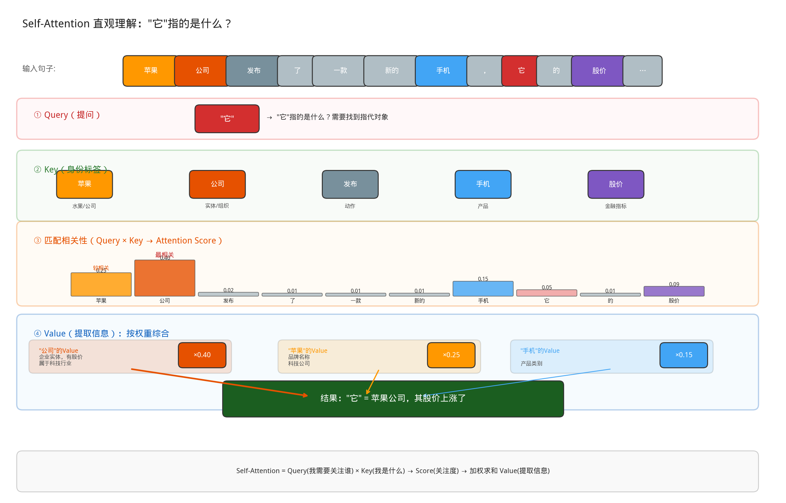 • 提取信息(Value):确定“它”指“苹果公司”后,你从“公司”这个词背后提取的信息(Value)是:这是一个企业实体,有股价,属于科技行业……,最终,你综合所有词的信息(但主要权重给了“公司”),得出理解:“它” = 苹果公司,其股价上涨了。