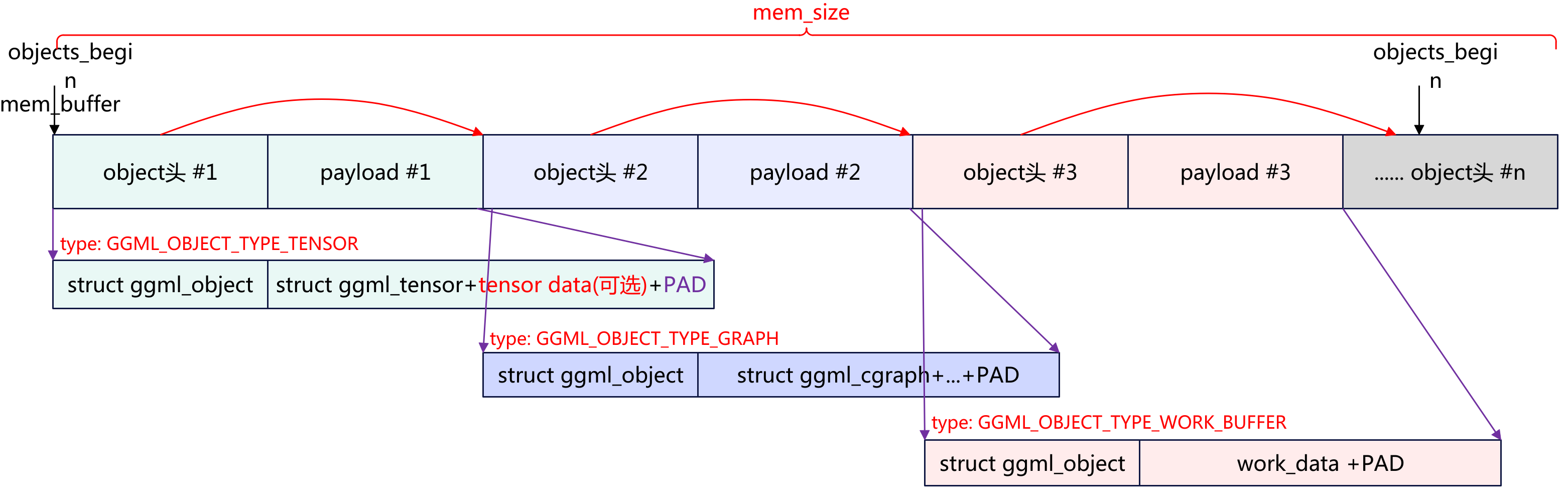 GGUF(GGML Universal Format)是 llama.cpp 的模型文件格式。gguf_init_from_file()按顺序解析其二进制结构。上图展示了 GGUF 文件的二进制布局,从上到下依次是: