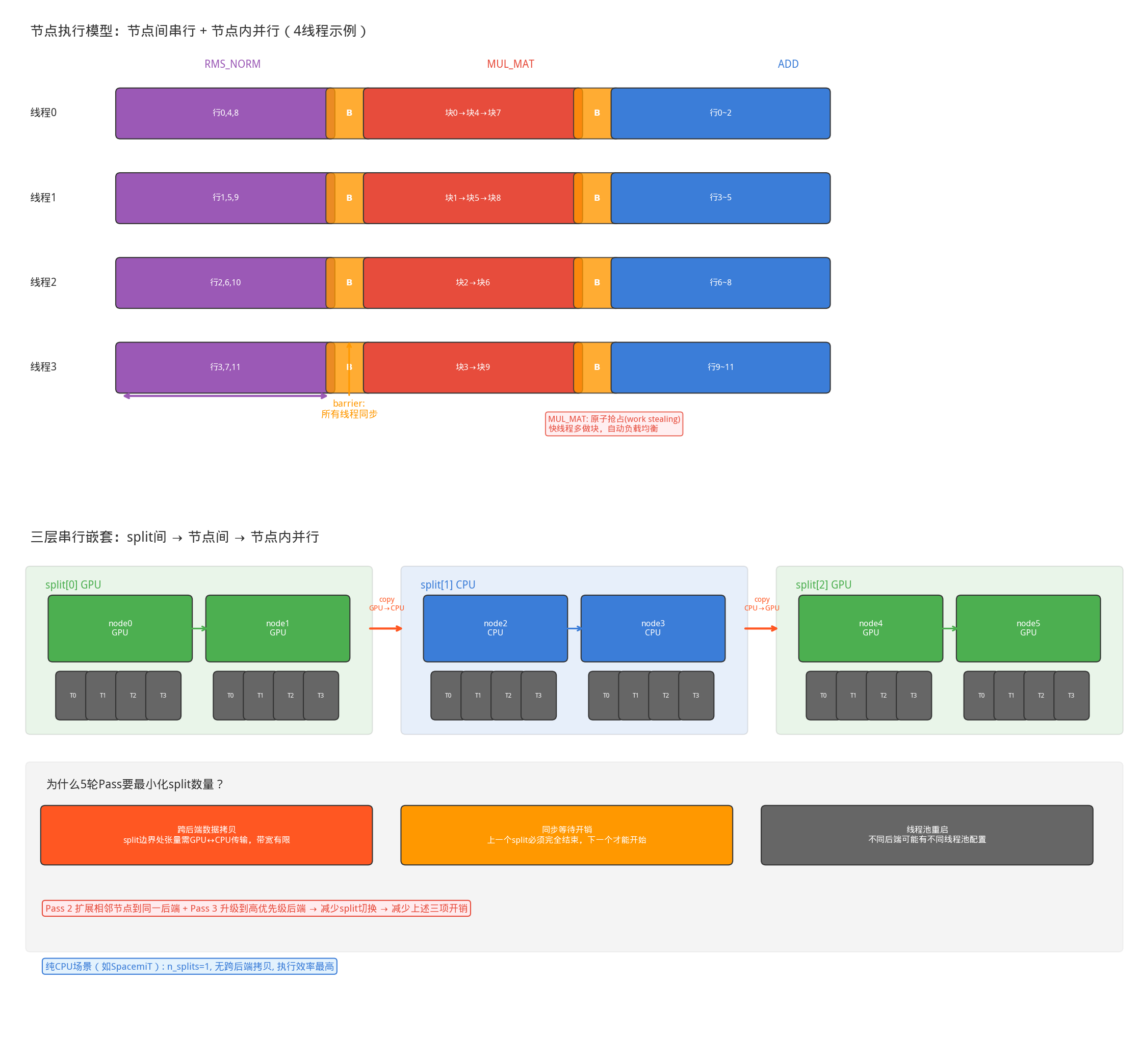 模式三:原子抢占(Work Stealing) — MUL_MAT 使用。将输出矩阵切成小块,线程通过原子操作抢占下一个可用块:这种模式的优势:自动负载均衡。快的线程多做几块,慢的线程少做几块,避免木桶效应。
