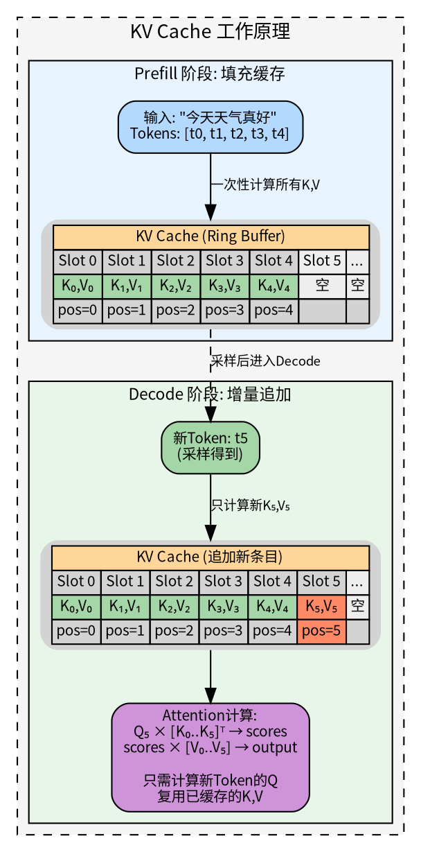 • MLA 由 DeepSeek 在 DeepSeek-V2(2024)中提出,是目前 KV Cache 压缩最激进的方案。核心思想:不再缓存完整的 K 和 V,而是将它们压缩为一个低维的潜变量(latent variable) ckvckv,推理时再通过上投影矩阵恢复。KV Cache 只需存储 ckvckv(维度 d_c),而非完整的 K 和 V(维度 h×d_k + h×d_v)。DeepSeek-V2 中 d_c=512,而 h×d_k=12288,压缩比高达 24 倍。