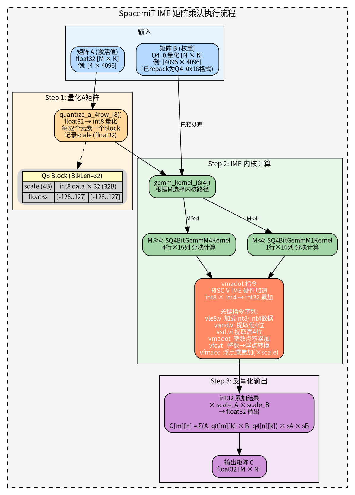 • 阶段三:IME 内核计算:核心计算由 gemm_kernel_i8i4() 完成(ime1_kernels.cpp:3157),根据 M 的大小选择不同路径: