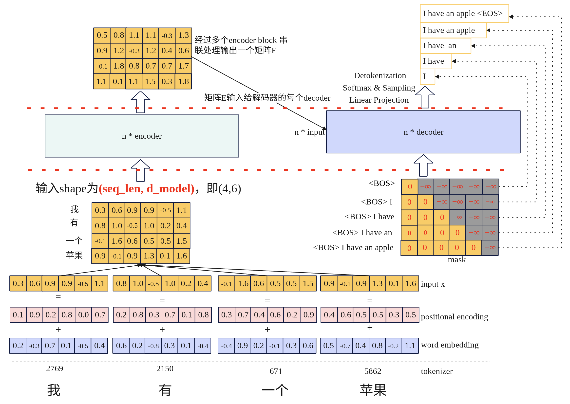 • Word Embedding(词嵌入):将每个Token ID转换为一个稠密的、可学习的向量,这个向量能捕捉词语的语义信息。