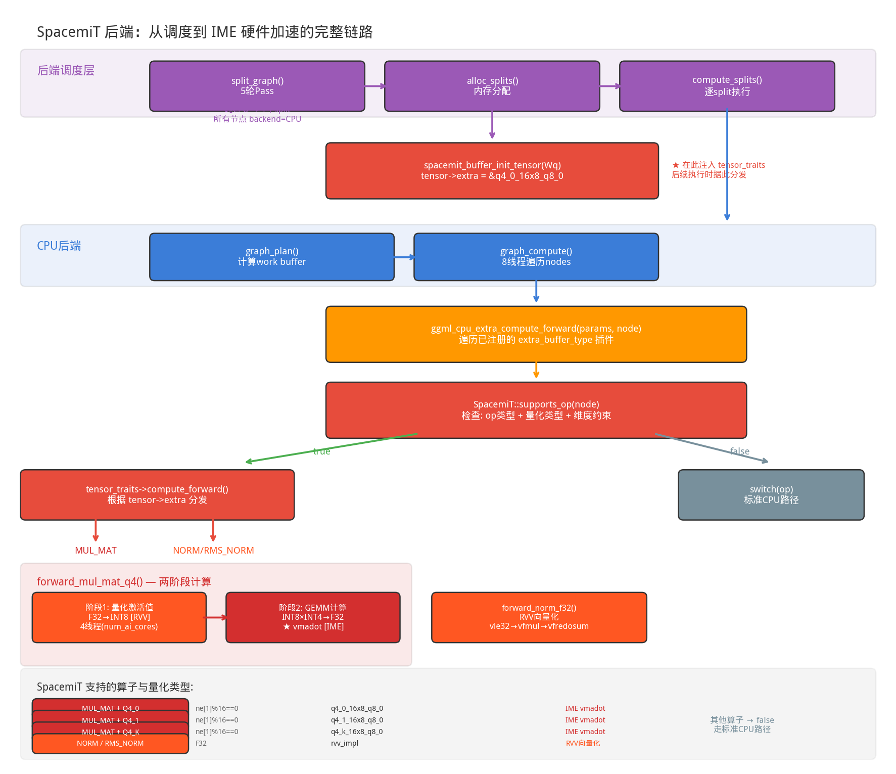 SpacemiT 后端通过 extra_buffer_type 插件机制注册(ggml-cpu/spacemit/ime.cpp),目前支持 3 个算子:
