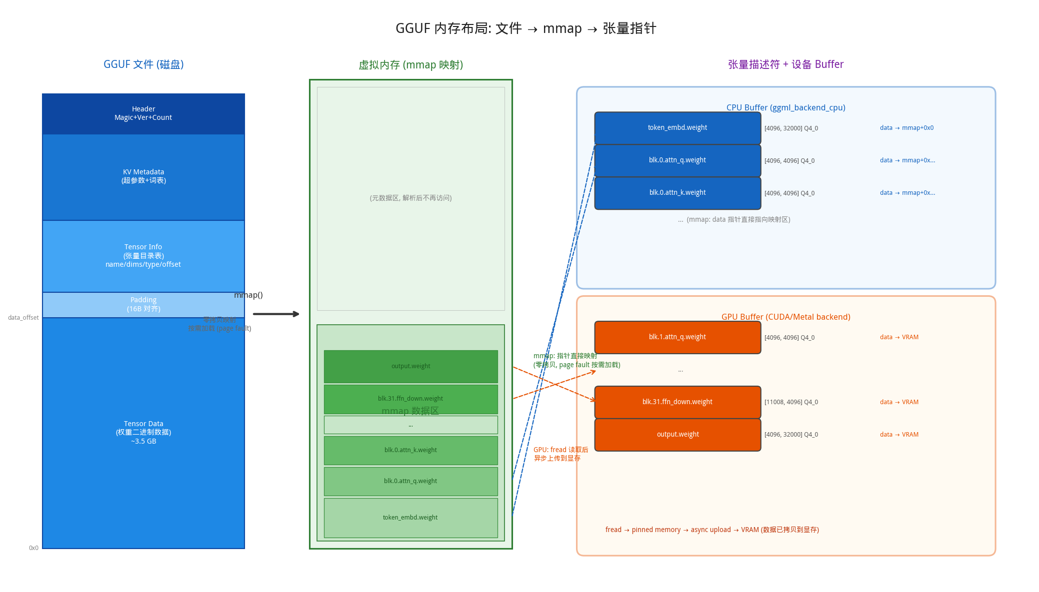 这些参数直接决定了每个权重张量的形状。例如 attn_q.weight 的形状是 [n_embd, n_embd] = [4096, 4096],ffn_gate.weight 的形状是 [n_embd, n_ff] = [4096, 11008]。此外还会解析 RoPE 相关参数(rope_type、rope_freq_base)和归一化参数(norm_eps)等。